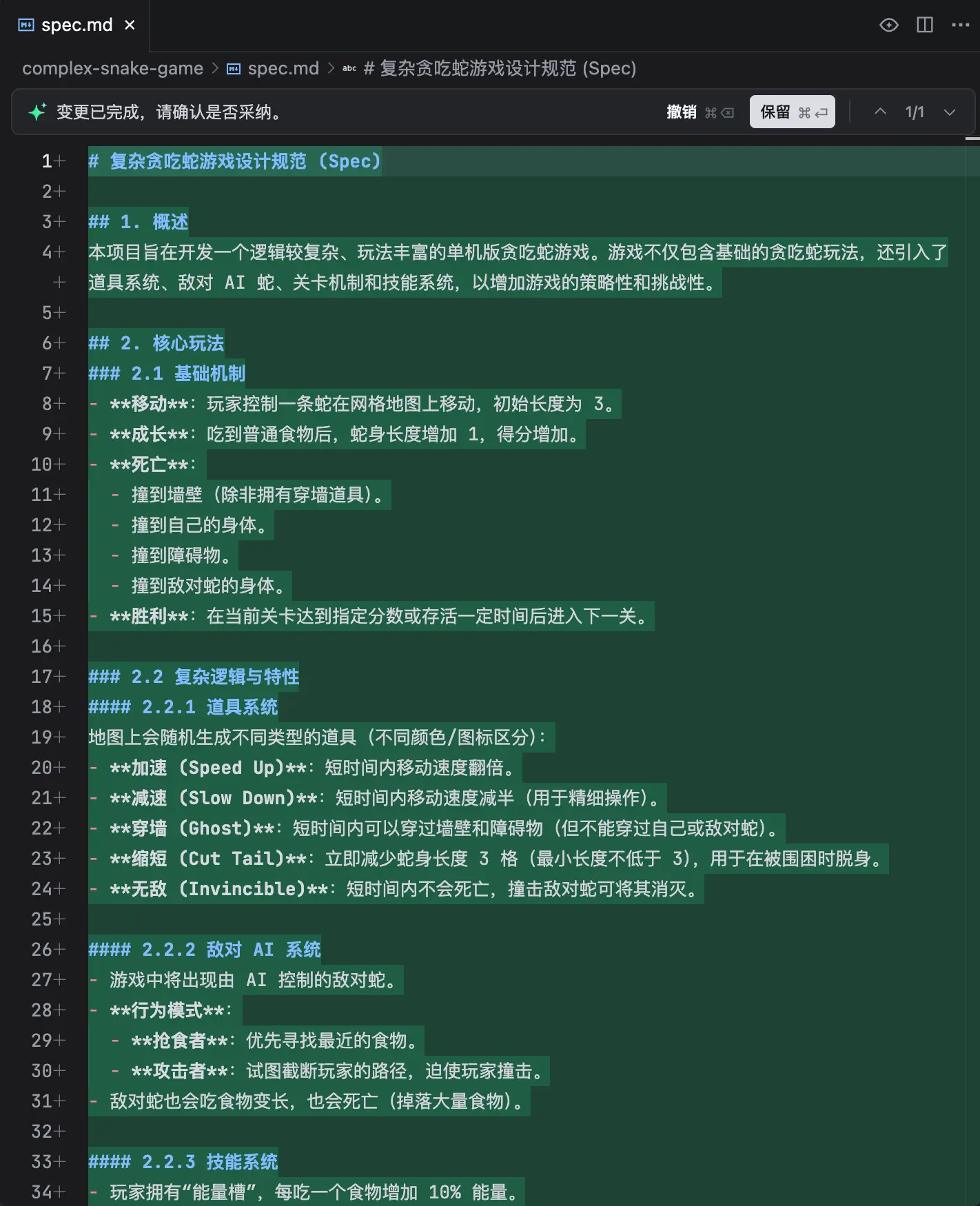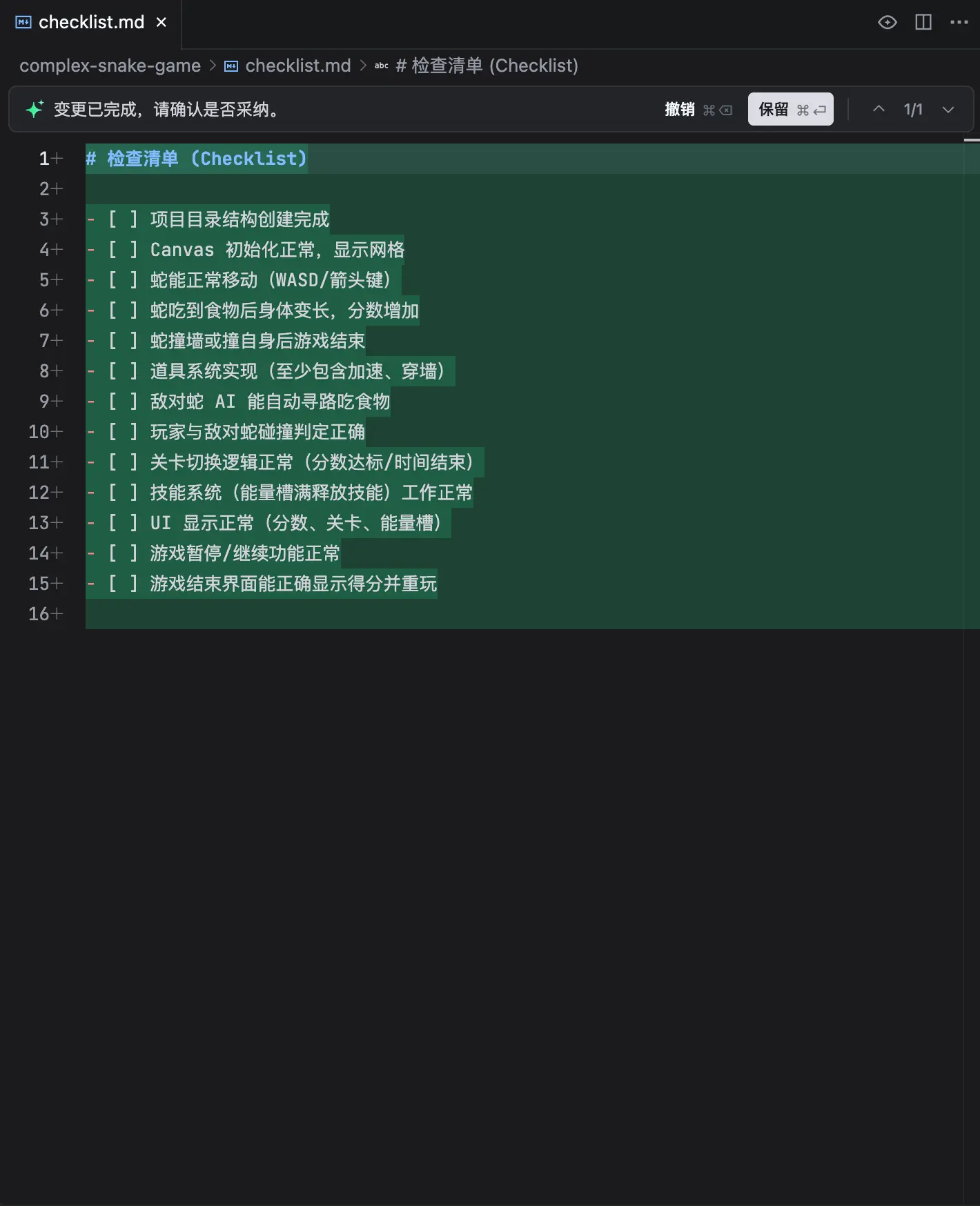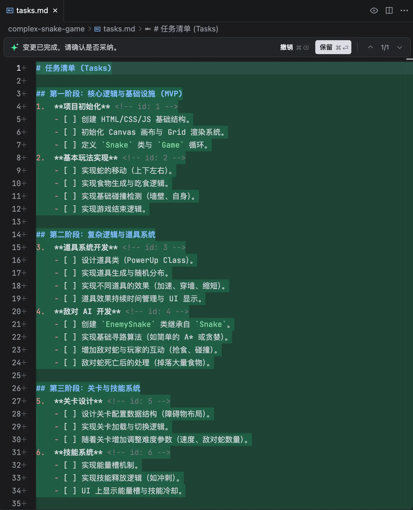 上述文档被首次创建时,SOLO Coder 会暂停并等待你确认。在此阶段你可以直接编辑文档内容,也可以用自然语言告诉 SOLO Coder 你希望修改的部分,SOLO Coder 会据此修改文档。确认执行后,任务列表和验收清单的状态会随着执行进度自动更新。